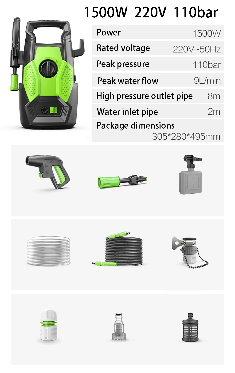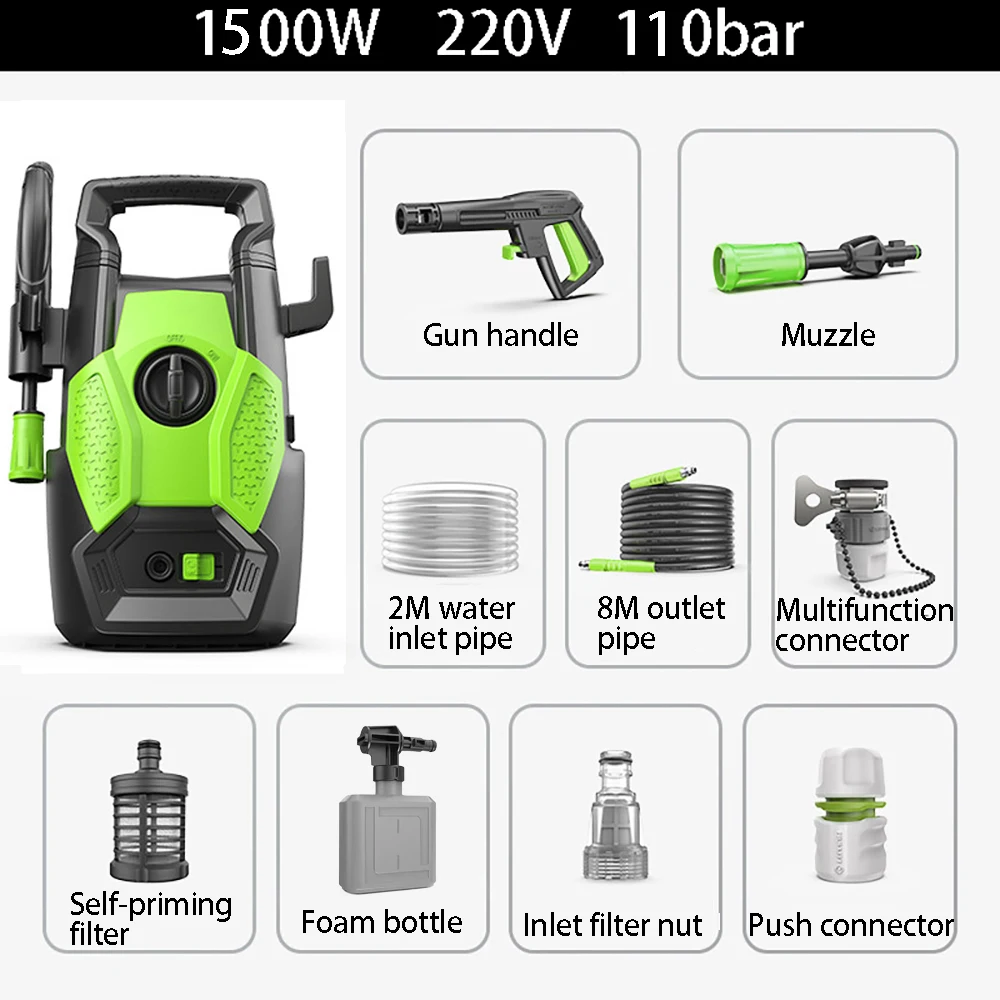 1500W Lavatrice Idropulitrice ad alta pressione per auto Strumento di pulizia domestica 220V Spina europea Pressione di picco 110Bar