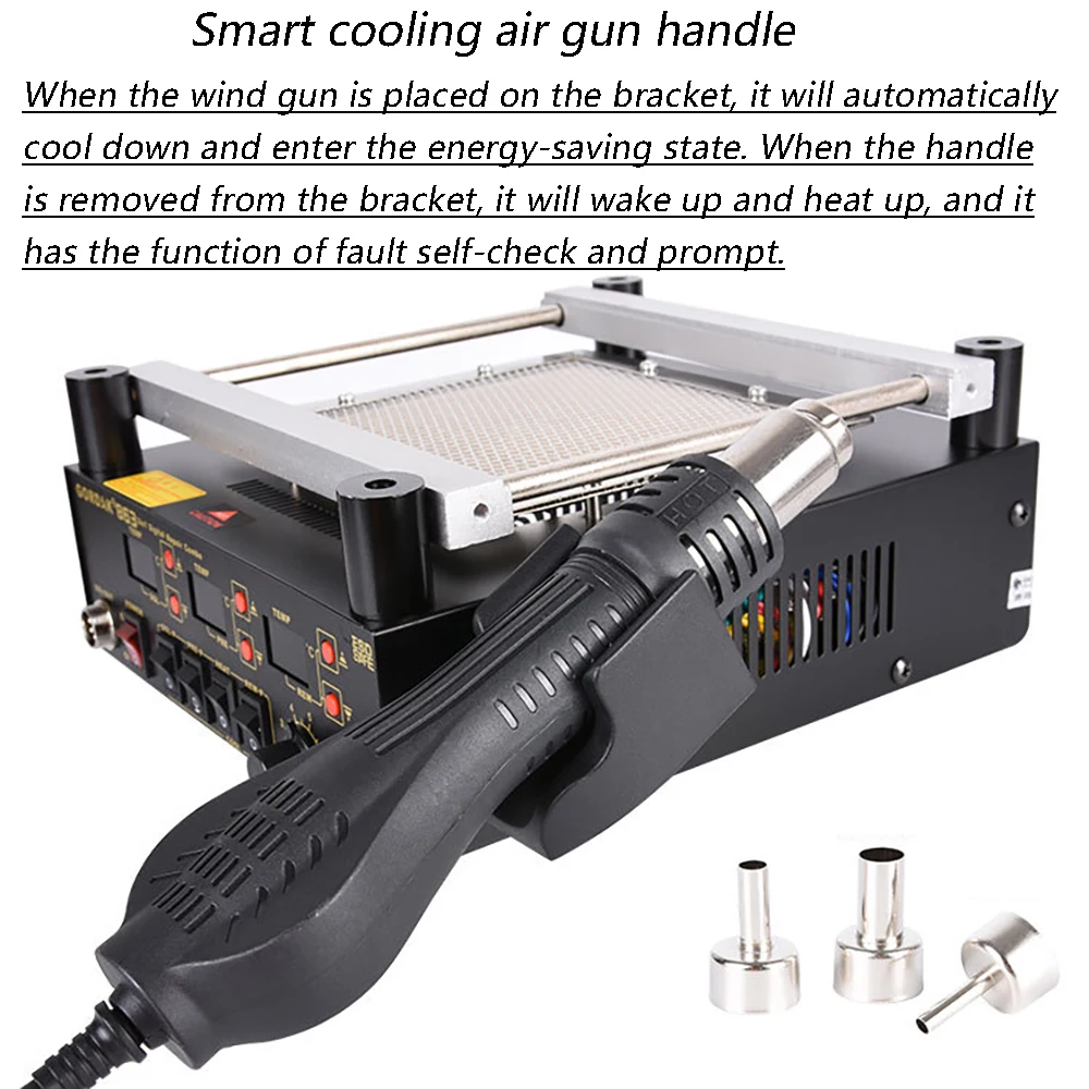 Quando la pistola a vento viene posizionata sulla staffa, si raffredda automaticamente e entra nello stato di risparmio energetico. Quando la maniglia viene rimossa dalla staffa, si sveglia e si riscalda e ha la funzione di errore autocontrollo e prompt.