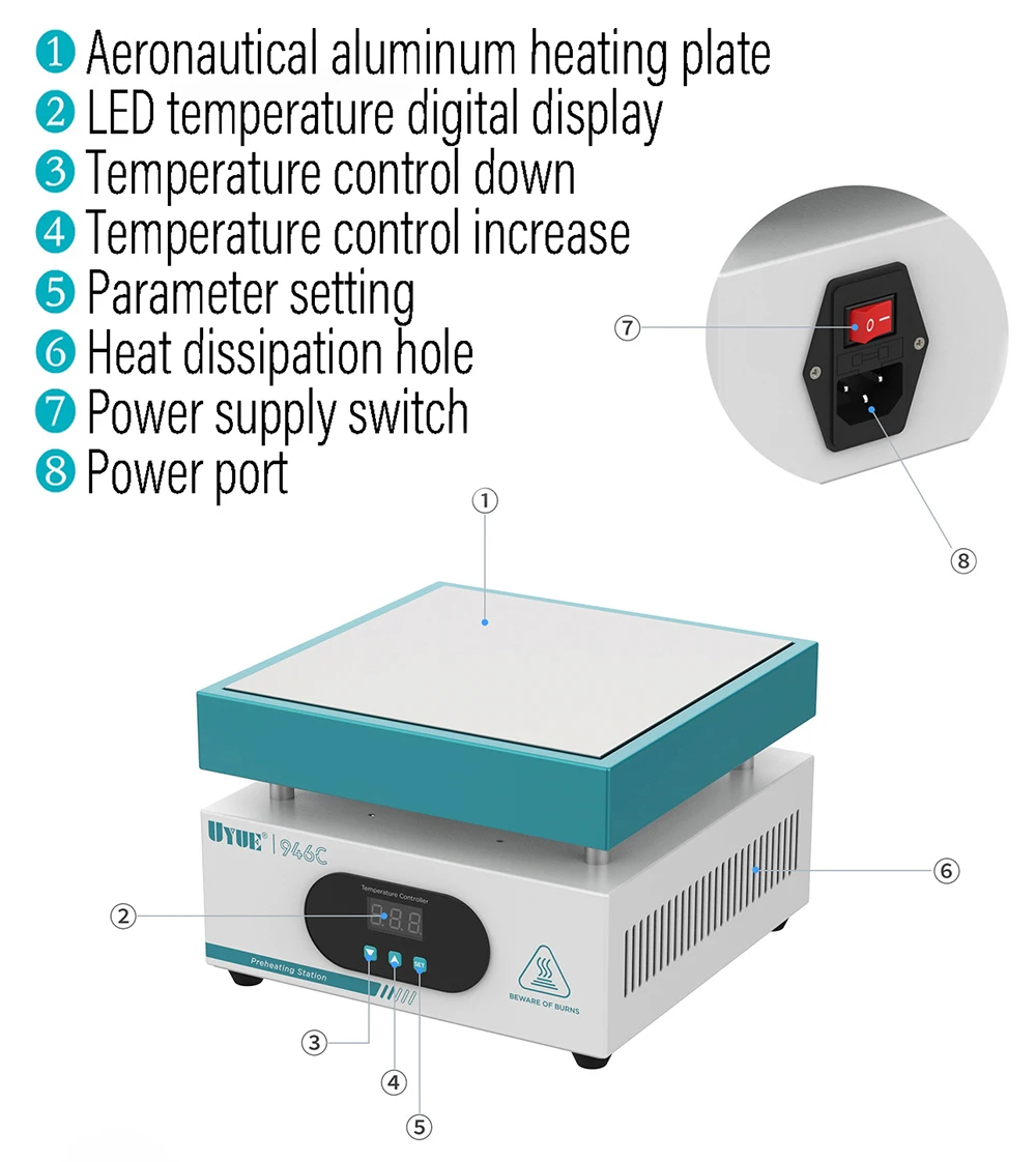 1. Piastra metallica riscaldante automatica, la temperatura massima è di 120 centigradi.